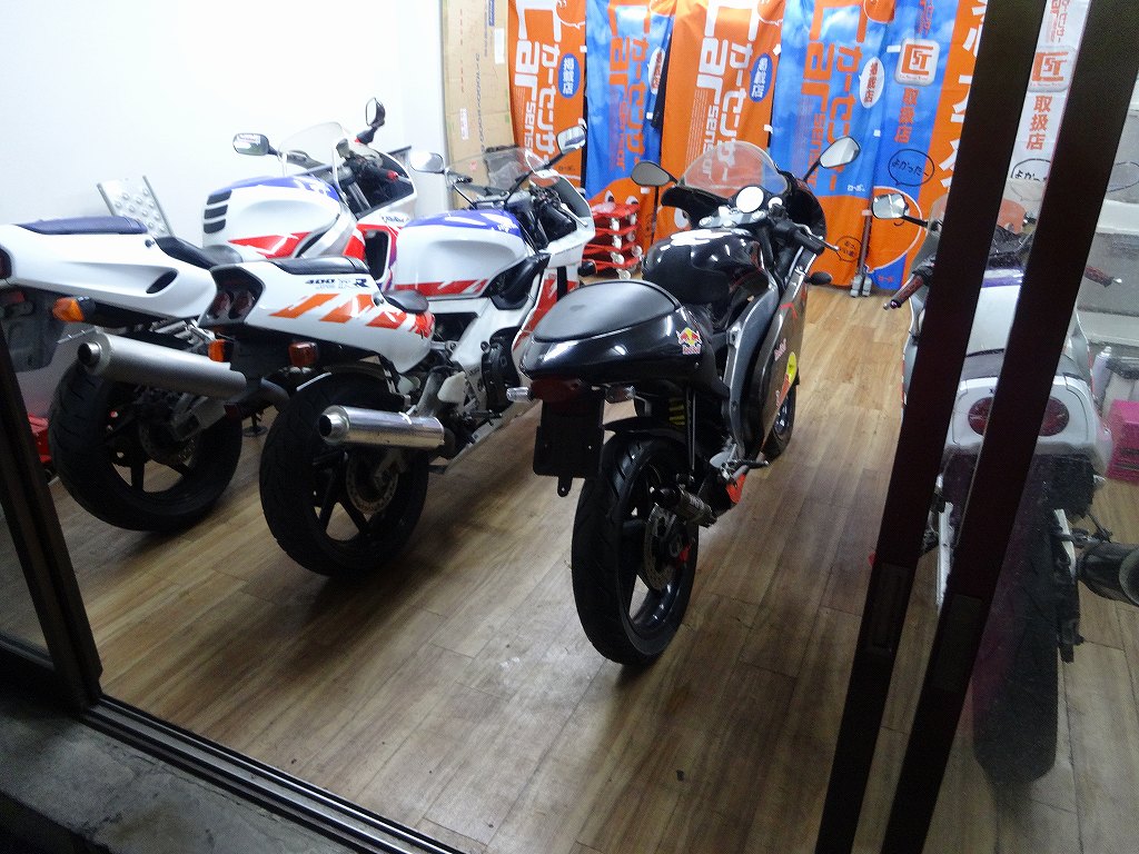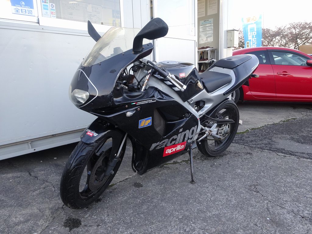 当店でトップクラスの人気を誇るバイクの1台に、アプリリア・RS50と言うバイクがあります。RS50は50ccと言う最低限の排気量でありながら、2ストロークエンジンからとんでもない加速と最高速度を叩き出す、50cc最強クラスのマシンです。残念な事に現在では50ccで公道を走れる2ストローク車の新車は販売されていません。もちろん今後も発売される事はまず無いでしょう。既に生産終了しているホンダ・NSR50やヤマハ・TZR50等の50ccの2ストローク車は今では希少性が手伝って、とんでもない値段になっていますので、探している方は高いのに程度の悪い個体を掴まされないように気を付けて下さい。このクラスのバイクの人気はやはり「少ない排気量でハイパワー!」と言う部分だと思います。50ccと言う普通自動車免許を持っている方なら、誰でも乗れると言うのはやはり大きなポイントです。「バイクの免許を取りに行く時間は無いけれども、楽しいスポーティなバイクに乗りたい!」と言う方は結構多いのではないでしょうか?また、車を持っている方なら「ファミリーバイク特約」と言う自動車保険のオプションで、125ccまでならそのまま車と同じ条件でバイクも保証されるのも大きいです。しかもファミリーバイク特約の保険料は月間1000円以下!毎月数百円でバイクの楽しさが味わえるなら格安だと思います。
