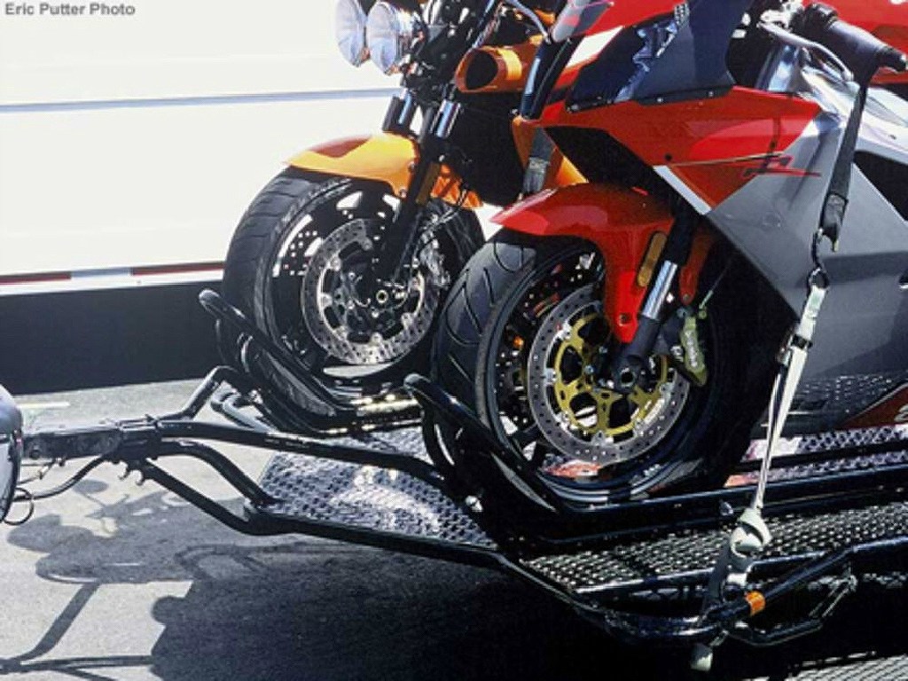 バイクをトラックやトレーラに積んだ時に、バイクを固定するために「タイダウン」と呼ばれる固定用のベルトを使います。人によって使う本数はそれぞれですが、当店は安全のために基本的に1台に4本のタイダウンを使用します。フロントとリアに2本づつ使って固定するのですが、タイダウンはきちんと使えばとんでもなく強力にバイクを固定してくれるのです。金属等の固定器具ではなくてベルトだからなのかは不明ですが「タイダウンだけだと何か不安・・・」と言う方結構います。タイダウンに安心出来ない方は、タイダウンの本当の使い方を知らない可能性があるので1回使い方を見直してみると良いと思います。基本的に「タイダウンだけだとグラグラする。」と言う方は、単純にタイダウンの張りが弱いだけの可能性があります。当店はラチェット式のタイダウンを使用していますが、ラチェットをフロントサスペンションがそれなりに沈むレベルまでキツく締めれば、まずバイクがズレる事はありません。特にオフロードバイクを積んだ場合に多いのですが、オフロードバイクはサスペンションのストロークが長いので、トラックやトレーラーが段差を越える時にサスペンションが上下してタイダウンがズレる事があるのです。このような事が起きないように、特にオフロードバイクはサスペンションが完全に沈み込む手前くらいまでキツく締める必要があるのです。きちんとタイダウンを締めた状態であれば、サイドスタンドを立てない状態でもバイクはズレません。それなりの速度で走行してもまったく問題はありませんので、「バイクが輸送中にリアで動いていて不安・・・」と言う方はぜひ使い方をご確認下さい。