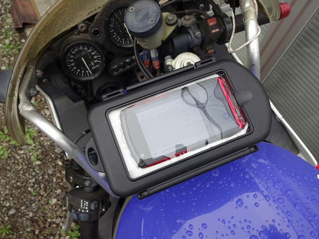 突然ですが、私は方向感覚があまりよろしくありません。ツーリング等に参加しても平均速度が非常に遅いので、かなりの確率で他のメンバーに置いていかれます。まぁ一緒にツーリングに行っているメンバーが当店在籍のプロライダー連中なので、置いていかれるのは仕方ないのですが問題は置いて行かれた後です。知らない土地で1人になってしまうと、帰れる自信がまったく無いのでナビゲーションシステムと言う文明の利器は必需品なのですが、バイクにナビを搭載すると言うのは結構難しいモノがあります。もちろん専用品を搭載してしまうのが最も早いと思うのですが、個人的にはグーグルナビを使用したいと言うのとなるべくリーズナブルに済ませたいと言う気持ちがあるので、専用品はあまり考えに入りませんでした。結果、上記画像のようにスマートフォンをバイク用の専用カバーに入れて、電源はバイクから供給すると言うシステムに落ち着いたのですが、当然良い部分と悪い部分があります。まず良い部分ですが、それはやはりコストと常に最新の地図と情報と言う事です。コスト的には専用カバーと電源供給システム、ハンドルステー等すべて含んでも2万円までしません。専用カバーはタッチ感も良好で使い勝手は良いと言えると思います。「安くて使いやすい!」と聞くと欠点が無いようにも思えますが、実際にバイクに乗って使ってみると色々と悪い部分も見えて来ます。まず、画面なのですが光の角度によってかなり見えにくくなる場合があります。ナビを操作するためのクリアーなフィルムの部分が反射してしまうのです。早朝や夕方等は場合によってはまったく見えない状態になってしまいます。次にバッテリーの排熱処理の問題が挙げられます。スマートフォンはケース等に入れていない通常の状態ですらバッテリーがかなりの熱を持つので、防水性が高いバイク用のケース等に入れるとさらに熱が逃げません。私が体験したのは真夏の昼間にバッテリーを充電しながらナビを使用していたら、30分前後で充電が出来なくなりました。スマートフォンでナビを使い続けると、バッテリーの消費はかなり早くなります。車ならエアコンを入れて、車内を冷やしながら使えば充電しながらナビを使用する事も可能なのですが、バイクは冷やす方法が無いので加熱する一方です。結果、ツーリングの時は置いていかれた時のために、必要ない時はナビを使用しません。1人のツーリングの場合はちょこちょこ休憩を入れる事によって対応しています。ケースに放熱用の穴を増やせば多少は良くなるかもしれませんので、結果が解ったらまたお知らせしようと思います。