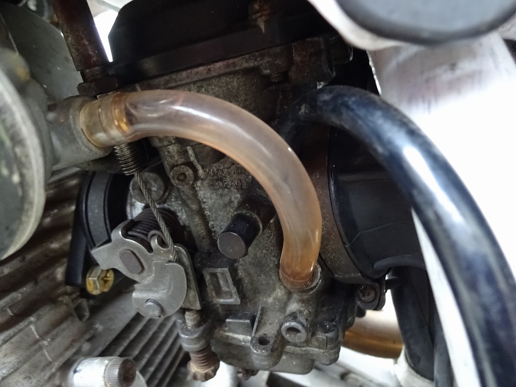 当店は古いバイクがメインなので、パーツ交換の際に独自の予防用のカスタムを施す場合があります。例えば上記画像のように、キャブへのガソリンラインを純正のブラックから透明なモノへ変更したりします。もちろんムダに交換するような事はありませんが、ガソリンラインが劣化して交換するレベルだったら透明なモノへと変更します。これは本来のブラックのラインから透明なモノにする事によって、サビ等のトラブルが発生した時に症状が初期の段階で気が付く事が出来るからです。透明な状態で普通にガソリンが流れていれば問題はないのですが、この透明なラインの中に異物を発見したら対応時期です。なぜこのような対応をするのかと言うと、バイクのトラブルを初期に発見出来る同時に「お客様自身に愛車の状態をきちんとチェックしてもらいたい。」と言う意味もあるのです。もちろん購入後のバイクをどう扱おうとお客様の自由ですが、せっかく拘って自身の好きな旧型のバイクをご購入頂いたのですから、なるべく長くご愛用頂きたいのです。古いバイクは当然メンテナンスフリーでは乗れません。キャブ車の適切な保管方法や、軽いトラブルの対処方法等はぜひオーナー様に知っておいてもらいたいのです。そのために、バイク側もオーナー様に状態を解ってもらいやすくするために、このような独自の対策を施しております。確かに当店のバイクは最新のバイクのように、「メンテナンスは基本的にオイル交換だけ。」と言うワケには行かないバイクもあります。キャブ車だったら、毎日乗るのでなければ保管時にはキャブ内のガソリンを抜いて保管したり、バッテリーの端子を外しておく等の基本的な事は必要になります。最新のインジェクション車だったら、ガソリンがダメにならない限りスターターを押すだけでエンジンは始動しますが、古いバイクはアクセルやチョークを微妙に調整する必要もあります。このような小さな面倒な事を「楽しい」と感じるか「面倒臭い」と感じるかで、古いバイクを楽しめるかどうかは大きく変わって来ます。当然ですが「面倒臭い」と感じる方は最新車をお買い求め下さい。