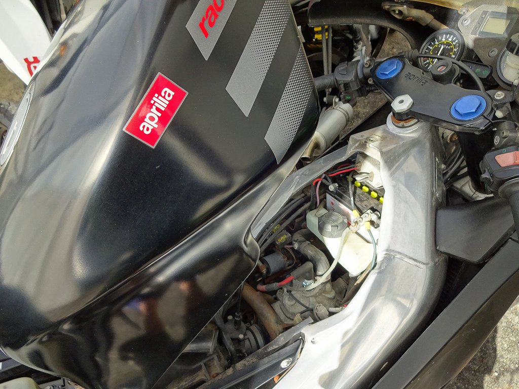 本日、以前にアプリリア・RS50を販売させて頂いたお客様からお電話を頂きました。何でも「売って頂いたRS50に乗っていたらアプリリアにハマってしまい、アプリリア・RS125も増車したんですがバッテリーの位置が解らないので教えてもらえませんか?」との事。確かにアプリリアはRS50とRS125で結構造りが違うので、同じ感覚だと面食らう事が多いと思います。ちなみにRS50のバッテリーはフロントシートの下にあるのですが、RS125はタンクの下にあります。RS125のバッテリーへのアクセス方法は、まずタンクのステアリング側のネジを外します。この時に一緒にフロントシートも外します。フロントシートは車体左側にロックがありますので、キーを挿し込んで回すとシートが外れます。タンクのネジを外したらタンクの前側を持ってそのまま持ち上げます。この時にフロントシートを外していないとタンクの縁がシートにぶつかってしまい、最悪シートが破れるので注意です。上記画像のようにタンクを持ち上げると、その下にバッテリーが見えているのが解ります。この状態でバッテリーの交換等を行うのですが大体の固体がこの状態でタンクを固定するステーが無くなっているので、何か代わりになるバー等で固定すると作業がしやすいと思います。ちなみに昔にすぐ面倒臭がる友達がタンクを自分の肘で固定しながら作業をしていたのですが、結局タンクが落ちて来てしまって置いていた工具を直撃し、なかなかのダメージを受けてしまったそうです。この時代のアプリリアはパーツも少なくなって来ていますので、何をするにもきちんと安心して出来る状態にして行う事をオススメします。