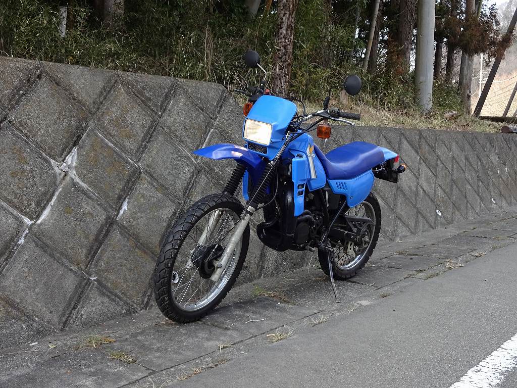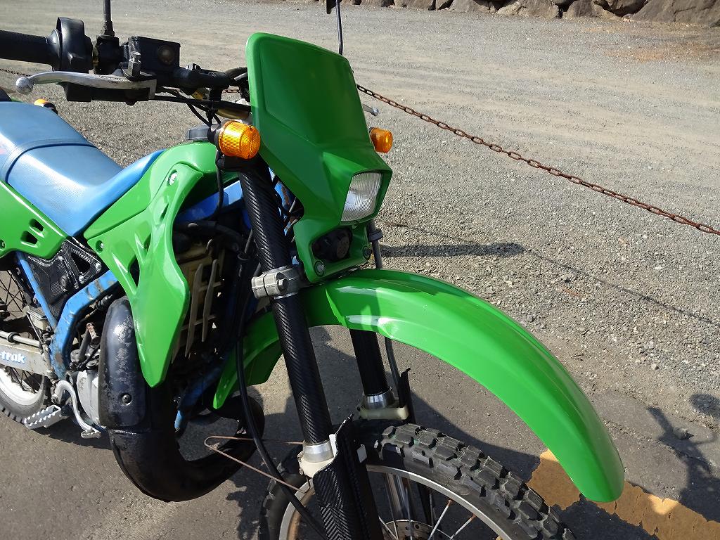 先日ご紹介した、カワサキ・KDX125SRのオールペイントが完成しました。オフロードバイクのカウルに多用されているPP(ポリプロピレン)樹脂は、柔らかさによる耐衝撃性が特徴だったのですが日光による劣化の早さや修復の難しさがネックでした。また、基本的にPP樹脂は後からのペイントはほぼ出来ない状態でしたが今回の塗料は耐衝撃性と柔軟性が非常に高い性質があり、PP樹脂にもしっかり食いつくので従来の塗料のように、すぐ剥げる心配はなさそうです。逆に食いつきが良くて柔軟性が高いせいで、キズの補修や再度の塗り替えはかなり大変です。塗料の柔軟性が高いので、サンドペーパー等で擦っても塗料が伸びるだけで落とす事がほぼ不可能なのです。そのため、もしカウル等が破損してしまった場合は同じカウルを購入して同色に塗り直すと言う手段が1番早いと思われます。愛車のオールペイントをお考えの方はぜひご相談下さい。ちなみに特殊塗料のため、通常の鈑金のように現在の色と合わせて塗る事は不可能です。塗料を作っているメーカーから出ている色の中からお選び頂く形になりますので、希望のカラーをご相談頂ければサンプル色をご用意します。ちなみに上記画像が今回オールペイントを施した実車となります。塗装後にかなり激しく100km近く走行しましたが、ヒビの1つも発生していません。オフロード車は振動が非常に強いため、通常塗料だと普通に走行しているだけで端から剥がれて来てしまうのですが、今回の塗料は問題なさそうです。かなり特殊な塗料なので条件や値段も普通の塗料とは違いますが、仕上がりと耐久性も普通とは違いますので愛車のカラーチェンジ等をお考えの方はぜひご検討下さい。今回オールペイントしたKDX125SRは、本店に展示しておりますのでご覧になりたい方はお電話で来店予約をお願いします。
