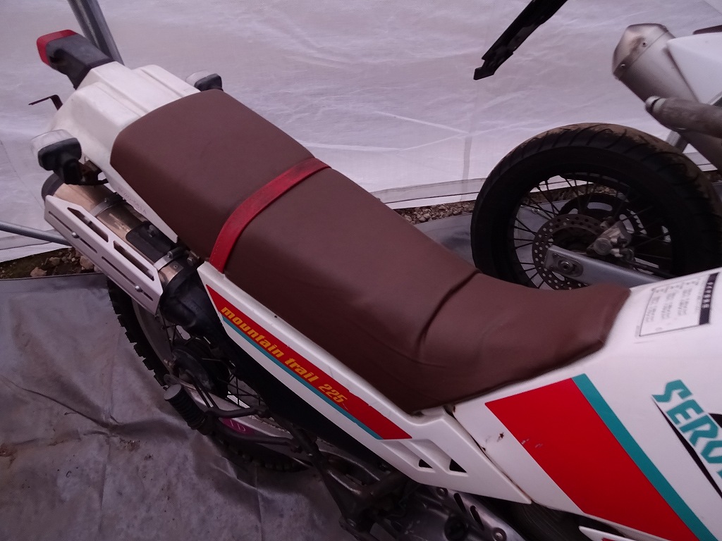当店在庫車のヤマハ・セロー225は、珍しいブラウンのシートになっています。色々なバイクのシートを見て来ましたが、ブラウンのシートと言うのは今までで2~3台くらいしか見た事ないくらい珍しいです。「ブラウンのシートってボディカラーに合うの?」と思われるかもしれませんが、これがレッド/ホワイトのセロー225の車体となかなかマッチしているのです。個人的にバイクのシートは、ホイールのカラーと同じくらい車体の印象を変えると思います。シート面積の比較的狭いスーパースポーツ系等でも、ライダーが乗っていなければシートもボディラインの一部になりますし、カウルとシートのカラーが違えばそこだけでもアクセントになります。考えてみたらフェラーリ等もボディカラーがロッソコルサ(明るいレッド)で内装がタンカラー(薄いブラウン)と言う組み合わせは多いですし、レッドとブラウンの相性が良い事は一般的なのかもしれません。しかし今回のセロー225のように、ボディカラーのレッドの割合がホワイトよりも全然少ない場合でもここまで似合うとは思いませんでした。ちなみにこちらのシートのように、愛車のシートのカラーチェンジも当店で可能ですのでぜひご相談下さい。「そろそろ破けたシートを張り替えしたいけど、せっかくだからちょっと変わった色にしたいな・・・」等とお考えの方はお気軽にご相談頂ければと思います。当店ではよっぽど特殊なカラーや、形状がとんでもない事になっているシートでない限り対応は出来ますので愛車でご来店頂くか、ご自身の好きなカラーと愛車の写真をメール等でお送り頂けたら見積もりさせて頂きますのでよろしくお願いします。
