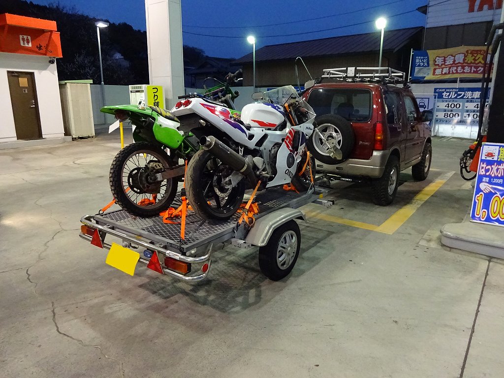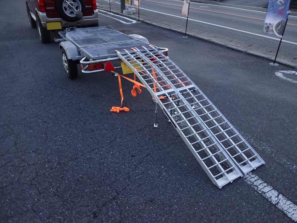 最近「自分もバイク用トレーラーの購入を考えているのだけど、バイクによって向き不向きはありますか?」と言う質問を頂きます。私もトレーラーを購入してから何十回も積み降ろしをしていますが、確かに積み降ろしのしやすいバイクとしにくいバイクはありますのでいくつか例をご紹介したいと思います。その前にバイクの大きさは小さければ小さい程、重さは軽ければ軽い程積み降ろししやすいです。個人的には排気量的には400cc、重さ的には150kgを超えると積み降ろしが格段にアップする感じがします。それではまず積み降ろししやすいバイクですが、ジャンル的にはオフロードバイクが1番だと思います。「全高が高いから積み降ろししにくいのでは?」と思う方もいるかもしれませんが、オフロードバイクのハンドル位置と全幅の短さはかなりやりやすいです。また最低地上高が高いのでラダーレールの種類を問わず、どんなレールでも下を擦らないで積み降ろし可能なのです。極端な話、250ccクラスくらいまでなら成人男性が二人いれば、ラダーレールが無くても積み降ろしが可能なのです。逆に1番積み降ろししにくいのは、フルカウルのスーパースポーツやレーサーレプリカです。フルカウルで車高が低いため専用のラダーレールが必要となりますし、ハンドルの位置が低いのでバランスを取るのが結構大変です。そして、トレーラーで重要なのは「トヨタ・ハイエース等のワンボックスと違って、左右に壁が無い。」と言う事です。ハイエース等をトランスポーターに使っている方は、車内の天井近辺のボディパネルにフックを付けてバイクを固定するパターンが多いです。バイクは上から固定すると、サスペンションの動きと関係無く固定出来るので、2本のタイダウンで充分固定出来ます。しかし、トレーラーは左右に壁が無いので下から固定するしかないのですが、これが大きな違いなのです。下から固定すると、トレーラーが道路の段差を越える時等の振動でバイクのサスペンションが動きます。バイクが上下に動く事によって、タイダウンが緩んで来てしまうのです。そのため、当店ではトレーラーを使用する時は必ずバイク1台に4本のタイダウンを使用します。また、タイダウンもラチェット式のきちんとキツく締まるモノのみを使用します。4本のタイダウンで、バイクのサスペンションがきちんと沈み込むくらいにキツく締めたらもう無敵です。バイクのサイドスタンド等使わなくても、バイクは微動だにしません。基本的にトレーラーに乗らないバイクはほとんどありませんので、トレーラーに載せる時のラダーレールやタイダウン等の道具の選び方と、積み降ろしの仕方を覚えてしまえば向き不向きは無いと言えると思います。トレーラーは状況に応じて色々な使い方が出来る便利な乗り物です。当店でもトレーラーのご紹介は可能ですので、検討されている方はぜひご相談下さい!