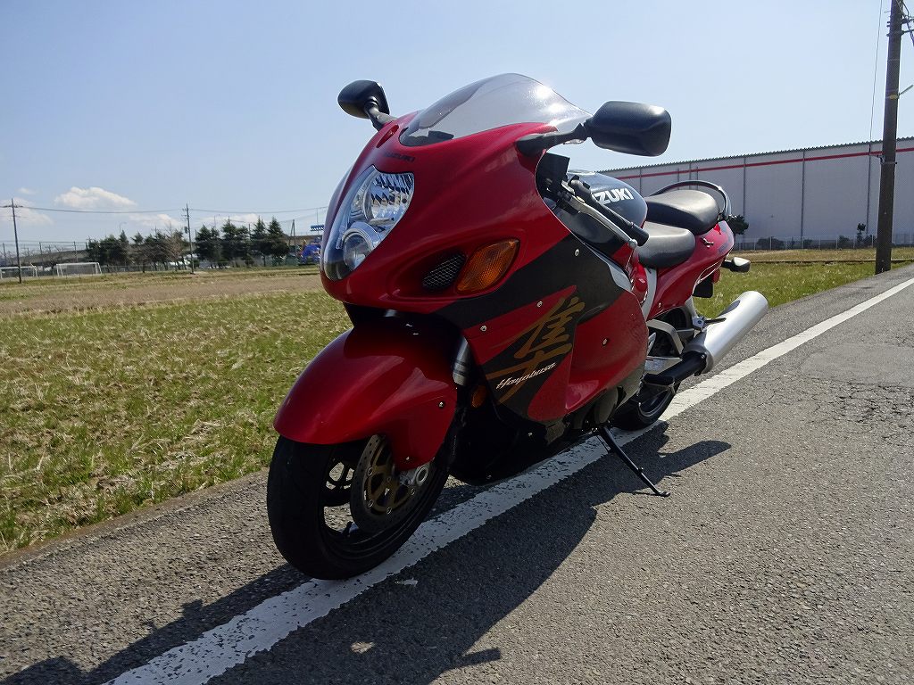 「世界最高速マシン」や「アルティメットスポーツ」等との物騒な呼び名だらけの最速マシン、スズキ・GSX1300Rハヤブサが入庫しました!詳細データは後日当店のホームページに掲載されますのでそちらからご確認下さい。もう説明するまでもありませんが、1999年に発売されると同時に大ブームとなり世界中で愛され続けた名車です。実測で300km/hを大幅に超える312km/hと言う記録を叩き出すと言うとんでもないマシンです。発売当時にそれまで最速と言われていたホンダ・CBR1100XXスーパーブラックバードやカワサキ・ZZ-R1100等と比較テストが行われましたが、ハヤブサの圧勝だったそうです。今回の固体は逆輸入車のフルパワーモデルで、希少な300km/hリミッターが装備される前の1999年式となります。もちろんスピードメーターもフルスケールで、最高速度は340km/hまでしっかりと刻まれています。余談ですが、私はまったく同じモデル(ボディカラーまで同じ。)を10年前に所有していた事があります。当時はまだ大型バイクの免許を取ったばかりだったので、ハヤブサのスゴさに圧倒されっぱなしで全然楽しめなかった記憶があります。今回、チェック走行で1時間くらい乗ったのですが「こんなに良いバイクだったんだ・・・」と改めて魅力を実感しました。今回は「売れなきゃスタッフの誰かが欲しがるから、別に売れなくてもかまわない。」と言う当店のコンセプトの、「スタッフの誰か。」が思い切り私です。車検も残っていますし、ツーリングや機関維持走行が今から楽しみです!