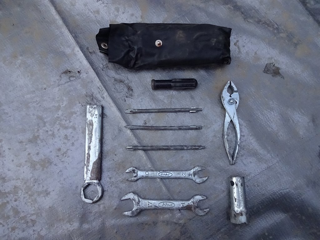 最近は、バイクに車載工具が搭載されている事自体を知らない方が増えた気がします。もちろん、最新の4ストロークエンジンのバイクならトラブルはほとんど無いでしょうが、昔の2ストロークエンジンのバイクは、出先でプラグがカブったりすると乾くまで待つか、プラグが寿命だと自身で交換する事になるので車載工具はそこそこ出番があります。そんな車載工具なのですが、「何でこんな場所!?」と言いたくなるような場所が多いです。上記写真は、先日ご成約頂いたホンダ・MTX125の車載工具です。一通りの工具が1番上に映っている黒いバッグに入っているのですが、このバッグの場所が問題なのです。
