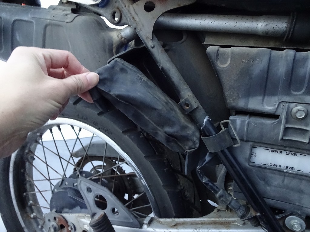 ご覧のようにサイドカウルの下に設置されているのです。つまり工具バッグを取り出すには、サイドカウルを外さないといけないのですが、大体の中古オフロードバイクはサイドカウルを留めているネジがプラスドライバーやレンチが必要な形状のモノになっていたりします。純正のネジはコイン等で回せる形状なのですが、中古だとネジを無くしてしまって違うネジに変えているモノが多いので、サイドカウルを外す時点でドライバー等が必要になって来る固体が多いのです。確かに車載工具にはドライバーセットが入っていますが、ドライバーを取り出すためにはドライバーが必要になってしまうのです。新しいオーナー様の考え方次第ではありますが、私がもしオーナーになるのであればサイドカウルを留めるネジは蝶ネジや純正のネジのように簡単に回せるモノに戻すと思います。
